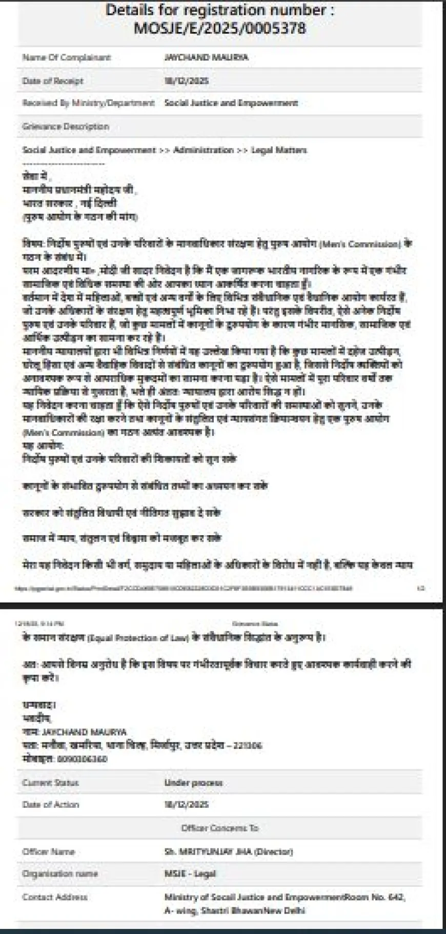 शिकायत को मंत्रालय द्वारा MOSJE/E/2025/0005378 पंजीकरण संख्या के अंतर्गत 01 दिसंबर 2025 को प्राप्त किया गया, जिस पर 18 दिसंबर 2025 को कार्रवाई की प्रक्रिया प्रारंभ होने की पुष्टि की गई है। वर्तमान में यह शिकायत ‘प्रक्रिया के तहत’ बताई जा रही है।