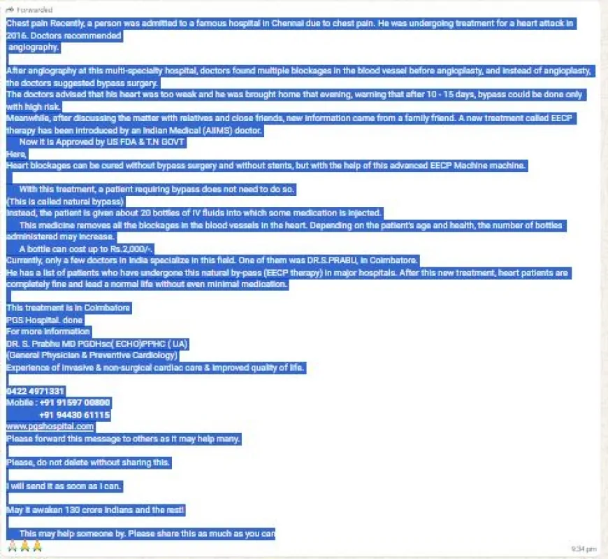 सोशल मीडिया व व्हाट्सऐप पर तेजी से एक लंबा संदेश वायरल हो रहा है। इसमें कहा गया है कि AIIMS के डॉक्टर द्वारा विकसित ‘EECP थेरेपी’ से हार्ट की सभी ब्लॉकेज बिना बाइपास सर्जरी और बिना स्टेंट के ‘20 बोतल ड्रिप’ के जरिए पूरी तरह साफ हो जाती हैं। दावा यह भी है कि यह तकनीक US FDA और तमिलनाडु सरकार द्वारा अप्रूव्ड है, यह ‘नेचुरल बायपास’ है, देश के कुछ चुनिंदा डॉक्टर (विशेषकर कोयंबटूर के डॉ. एस. प्रभु) इसे कर रहे हैं, और इसे जितना हो सके, लोगों तक पहुँचाया जाए क्योंकि यह ‘दिल की बीमारी का चमत्कारी इलाज’ है।