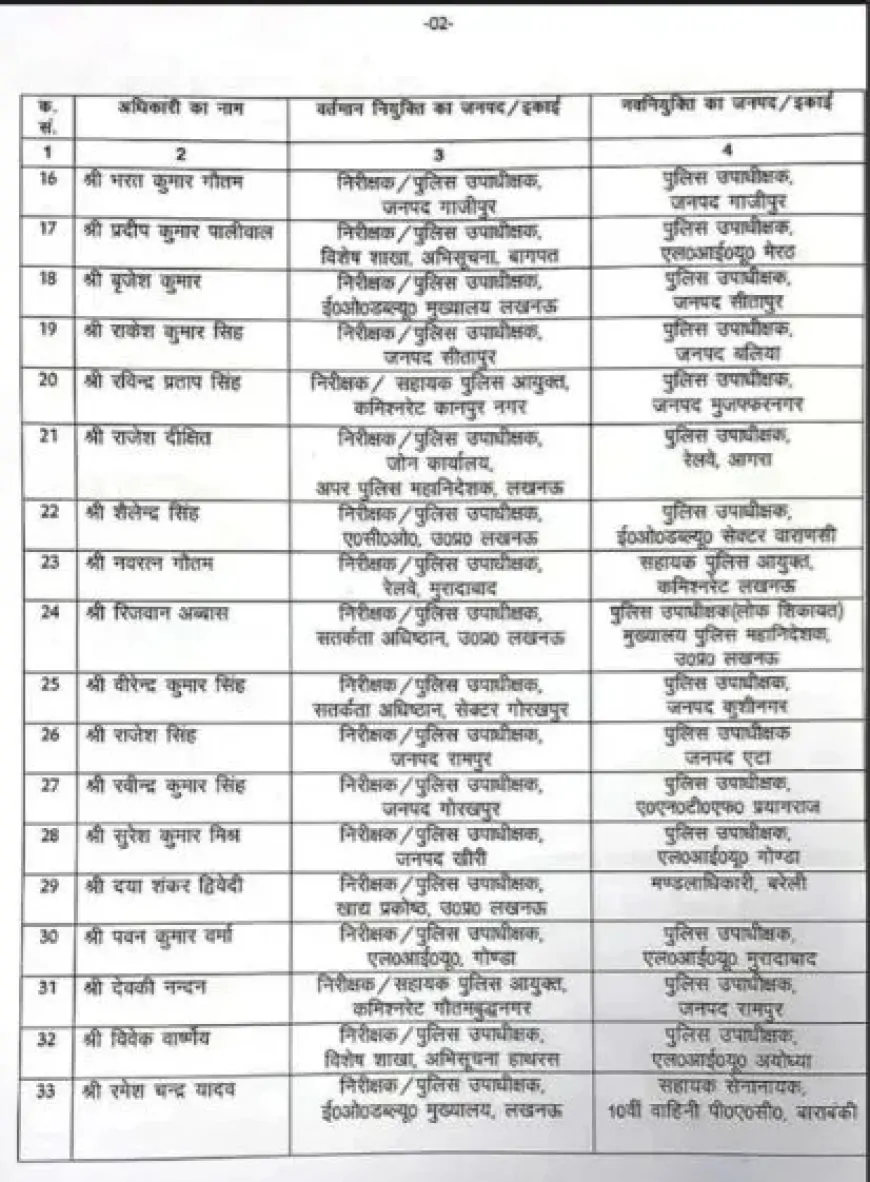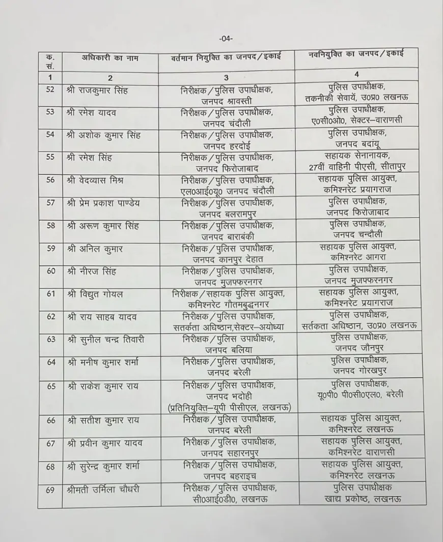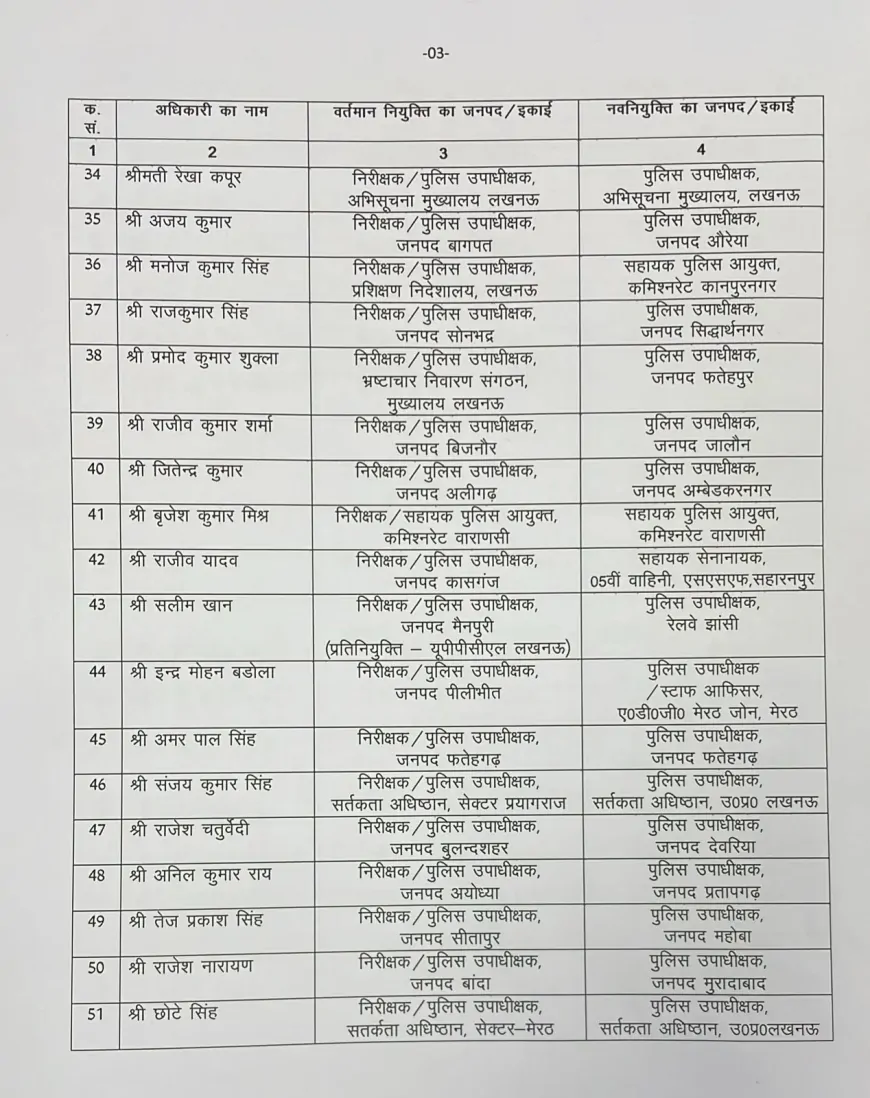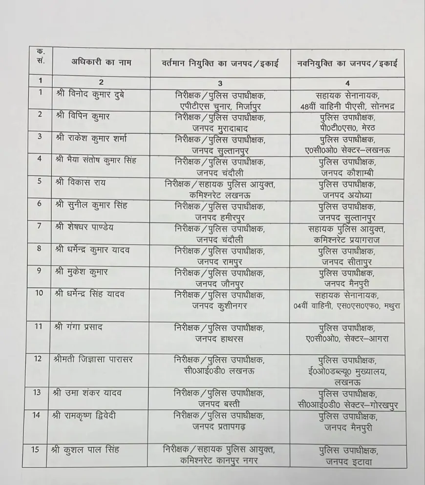 इसी तरह, शेषधर पांडेय को प्रयागराज, धर्मेंद्र कुमार यादव को सीतापुर, मुकेश कुमार को मैनपुरी, धर्मेंद्र सिंह यादव को एसएसएफ मथुरा, और जिज्ञासा पारासर को ईओडब्ल्यू मुख्यालय लखनऊ भेजा गया है।