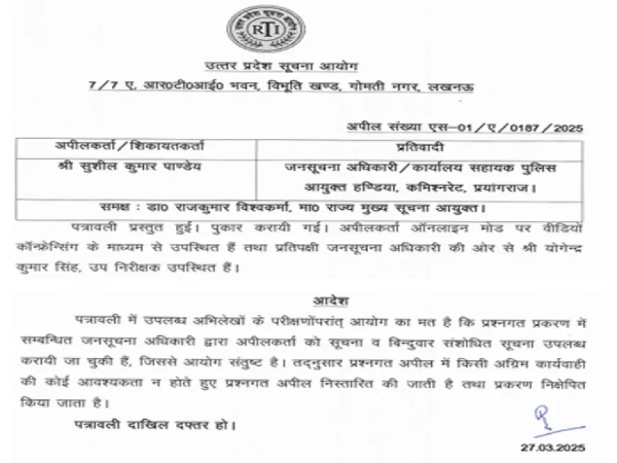 जब पांडेय ने राज्य सूचना आयोग में अपील की तो मुख्य सूचना आयुक्त राजकुमार विश्वकर्मा ने 27 मार्च 2025 को आदेश देते हुए कहा, “संशोधित सूचना उपलब्ध करा दी गई है” और मामला निस्तारित कर दिया। जबकि वास्तविकता यह थी कि सूचना न अपूर्णता से मुक्त थी, न ही धारा 19(5) के तहत उचित ठहराई गई।