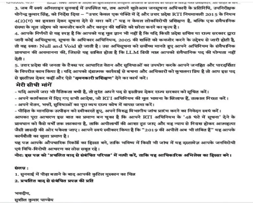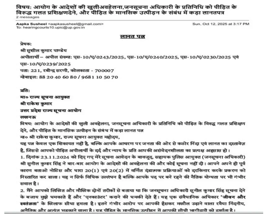 प्रयागराज के हंडिया निवासी सुशील कुमार पाण्डेय, जो कई लंबित अपीलों के अपीलार्थी हैं (अपील संख्या – एस-10/ए/0243/2025, एस-10/ए/0240/2025, एस-10/ए/0230/2025, एवं एस-10/ए/0239/2025), ने अपने पत्र में सूचना आयुक्त राकेश कुमार के खिलाफ कड़े शब्दों में लिखा है कि उन्होंने—
