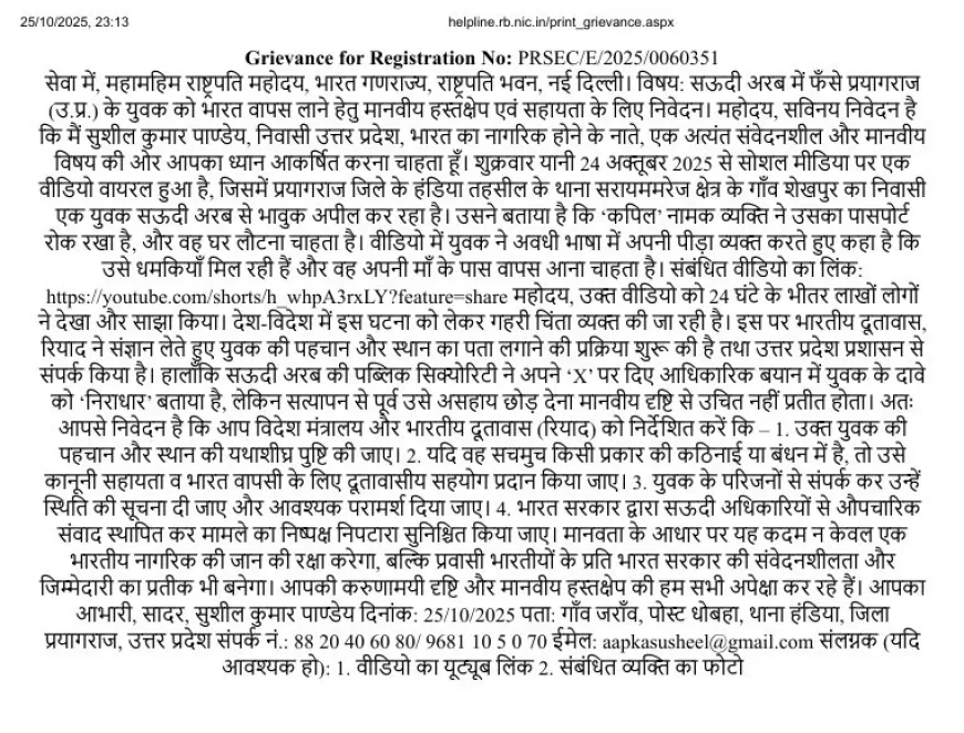 प्रयागराज / नई दिल्ली / रियाद, अक्टूबर 2025: सोशल मीडिया पर वायरल हुए एक वीडियो ने शुक्रवार को देशभर में हलचल मचा दी। वीडियो में सिर पर साफा बांधे एक युवक अवधी में रोते हुए यह दावा कर रहा है कि वह प्रयागराज जिले के हंडिया तहसील के थाना सरायममरेज क्षेत्र के गाँव शेखपुर का रहने वाला है और सऊदी अरब में फँस गया है। युवक ने अपने वीडियो में कहा कि ‘कपिल’ नाम के व्यक्ति ने उसका पासपोर्ट रोक लिया है और वह भारत लौटना चाहता है। वीडियो वायरल होने के कुछ ही घंटों में, इसे 1.4 लाख से अधिक बार देखा गया और हज़ारों लोगों ने इसे शेयर किया।