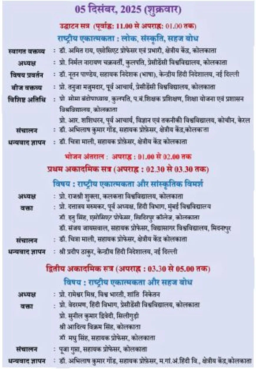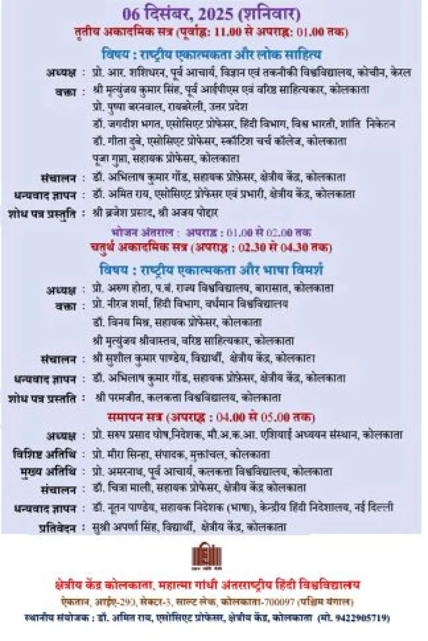 केंद्रीय हिंदी निदेशालय और महात्मा गांधी अंतरराष्ट्रीय हिंदी विश्वविद्यालय के क्षेत्रीय केंद्र, कोलकाता द्वारा 5–6 दिसंबर 2025 को ‘राष्ट्रीय एकात्मकताः लोक, संस्कृति, सहज बोध’ विषयक राष्ट्रीय संगोष्ठी आयोजित होने जा रही है। देशभर के विद्वान इसमें भाग लेंगे।