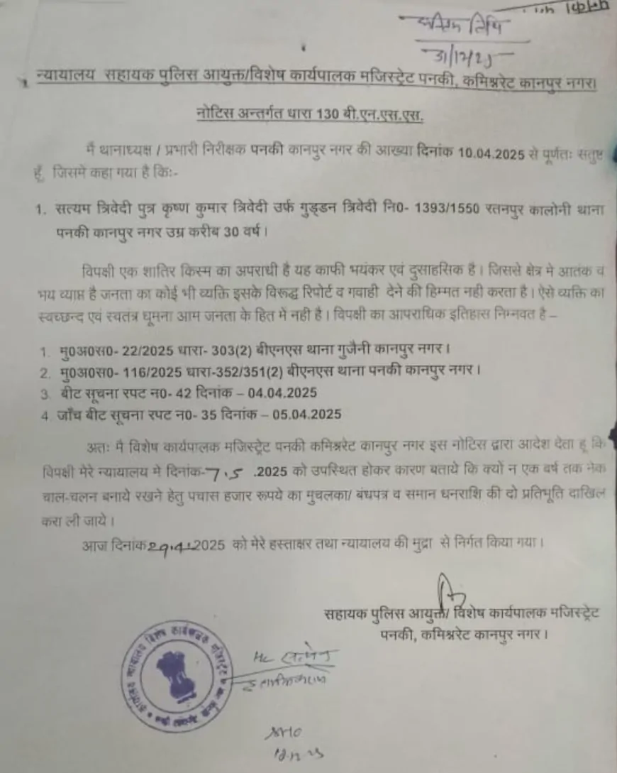 दिनांक 29 अप्रैल 2025 को सहायक पुलिस आयुक्त/विशेष कार्यपालक मजिस्ट्रेट, पनकी द्वारा जारी नोटिस में थानाध्यक्ष की 10.04.2025 की आख्या के आधार पर सत्यम त्रिवेदी को न्यायालय में उपस्थित होकर यह बताने का निर्देश दिया गया कि क्यों न उससे ₹50,000 का मुचलका और दो समान धनराशि की प्रतिभूतियाँ लेकर एक वर्ष तक नेक चाल-चलन बनाए रखने का आदेश पारित कर दिया जाए।