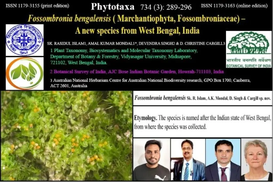 पश्चिम मिदनापुर के जंगल से विद्यासागर विश्वविद्यालय के शोधकर्ताओं ने नई पादप प्रजाति Fossombronia bengalensis की खोज की, जिसे अंतरराष्ट्रीय जर्नल Phytotaxa में प्रकाशित किया गया है।